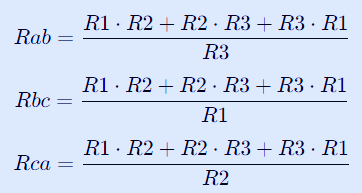 반대로, Δ 회로의 저항 Rab, Rbc, Rca를 Y 회로의 저항 R1, R2, R3로 변환하려면 다음 공식을 사용합니다.