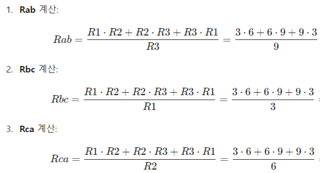 이렇게 하면 Δ 회로의 저항 값들을 기반으로 Y 회로의 저항을 구할 수 있습니다.