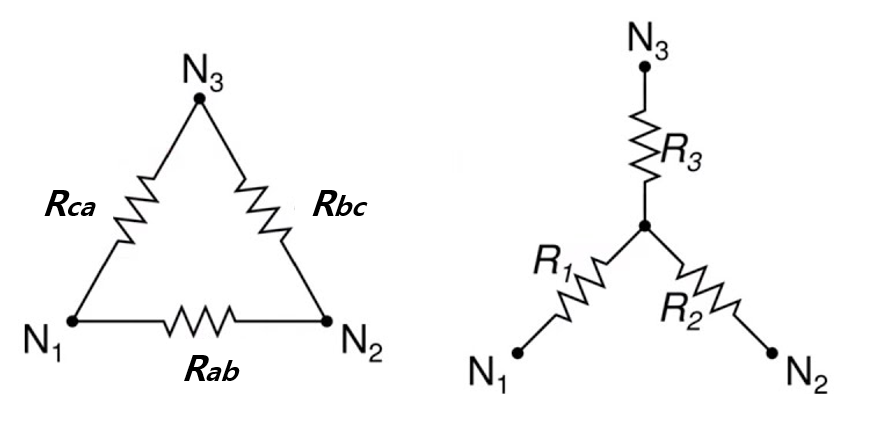두 회로는 물리적으로 다르지만, 각 저항 값에 따라 동일한 전기적 특성을 가질 수 있습니다. 이를 수학적으로 변환해주는 것이 Y-Δ 변환입니다.