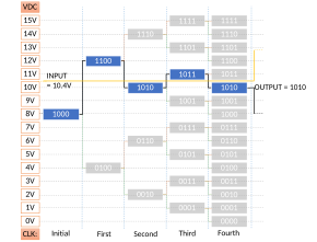 - MSB(Most Significant Bit, 최상위 비트)부터 하나씩 값을 결정하여 점진적으로 정확한 디지털 값을 찾아감.
